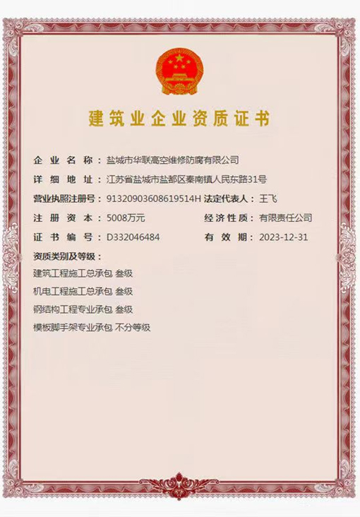 鹽城市華聯高空維修防腐有限公司始建于上世紀八十年代,系專業從事風力發電機塔筒防腐,塔筒維護,塔筒補漆,塔筒噴字等工程。不停產,不搭手架,高空懸吊施工的一級高空安全資質、一級高空防腐施工資質、二級建筑施工資質的高空建修、防腐工程、公司。現已發展集科研、設計、施工為一體的的江蘇省較大的高空建修,高空防腐施工企業;公司注冊資金3008萬元,流動資金8000多萬元;擁有高修技術科研高修工程設計、高修工程施工三大技術與施工組織體系;公司擁有一流的技術施工隊伍,其中有高級職稱36 名,中級職稱126人。具備一級防腐資質、一級安全資質及二級建筑資質,公司下轄五個分公司和十八個辦事處,為全國數百家企業解決了若干“高、大、難”的特殊工程項目,填補了我國建筑史上的空白。